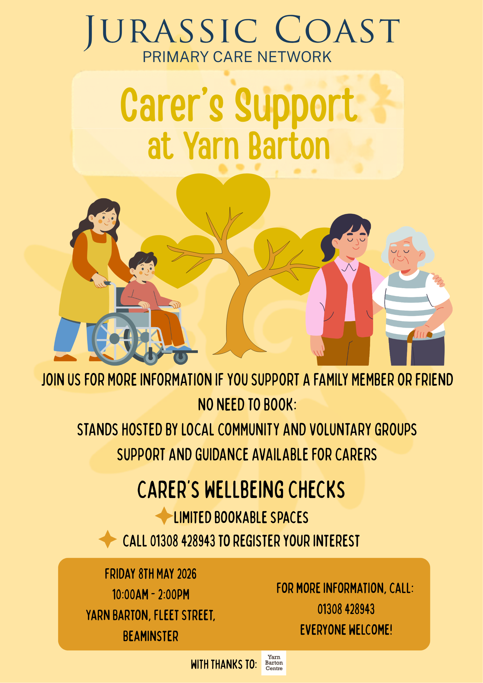 Join us at Yarn Barton, Fleet Street on Friday 8th May 2026, 10:00am – 2:00pm. This free drop-in event is open to anyone who supports a family member or friend. Browse stands hosted by local community and voluntary groups, and access support and guidance specifically for carers. No need to book to attend. Everyone welcome!.