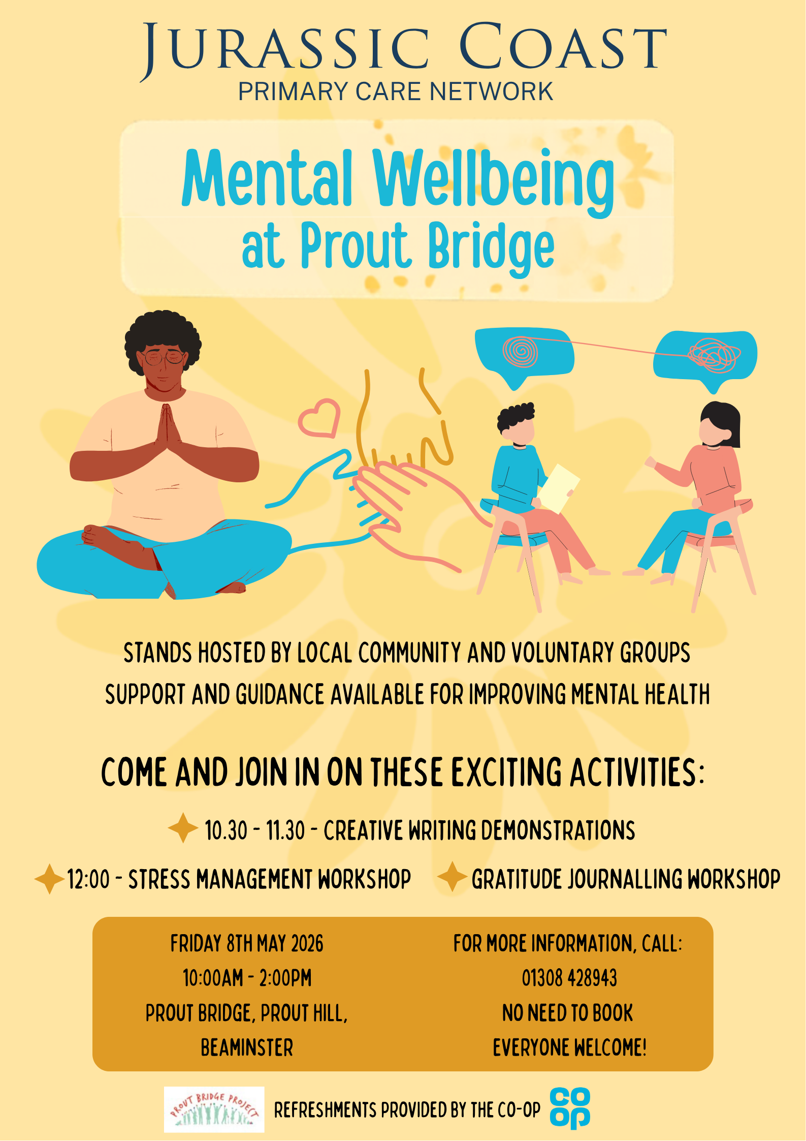 Join us at Prout Bridge, Prout Hill, Beaminster on Friday 8th May 2026, 10:00am – 2:00pm. This welcoming drop-in event features stands hosted by local community and voluntary groups offering support and guidance for improving mental health. Take part in a range of activities including Creative Writing Demonstrations, a Stress Management Workshop and a Gratitude Journalling Workshop. Refreshments provided by the Co-op. No need to book. Everyone welcome!