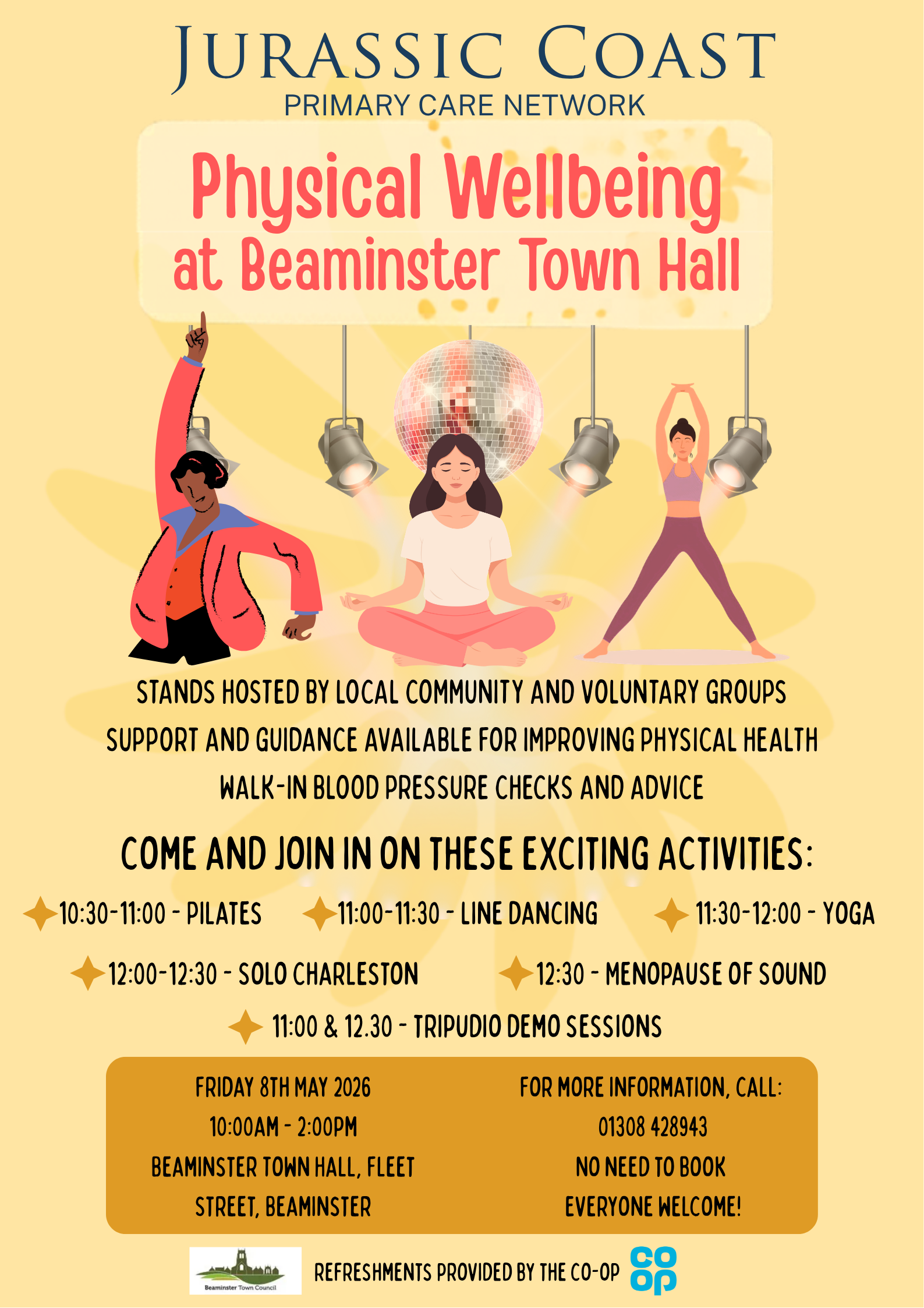 Join us at Beaminster Town Hall, Fleet Street on Friday 8th May 2026, 10:00am – 2:00pm. This fun drop-in event includes stands, walk-in blood pressure checks, and a fantastic lineup of activities: Pilates , Line Dancing , Yoga, Solo Charleston, Tripudio Demo Sessions and a Menopause of Sound session. Refreshments provided by the Co-op. No need to book. Everyone welcome!